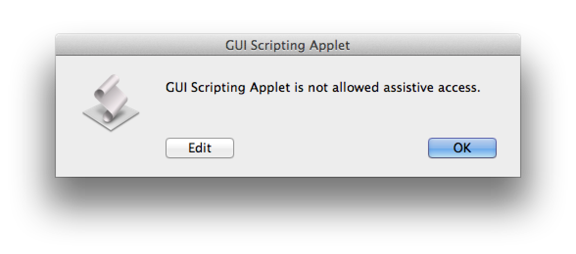 In OS X Mavericks, security controls are more granular, requiring the individual addition of applications, or automation applets that script the accessibility frameworks, to an approval list, displayed in the Security & Privacy system preference pane. (⬇ see below)