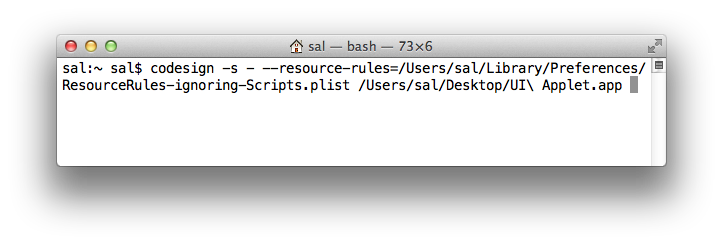 (⬆ see above) The signing command string in a Terminal window. Note the use of the backslash character (\) to escape the space in the applet name. All spaces within paths must be escaped in the command string.