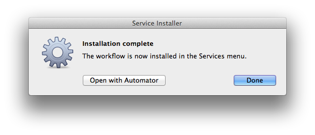 Once the installer has completed the installation process, a confirmation dialog will appear. The newly installed service is ready for use, and can be optionally opened in Automator for viewing and editing.