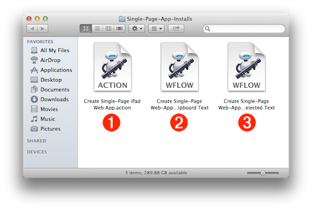 The first step of the installation process is to install the Automator action file that contains the code and interface for creating a web-application. Its file is the item in the folder whose icon displays ACTION.
