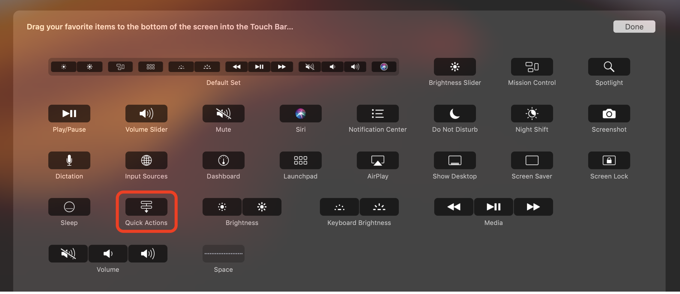 The Touch Bar configuration shown below is based upon the Default Set with the Quick Actions control (shown at far right) taking the place of the standard Siri control.