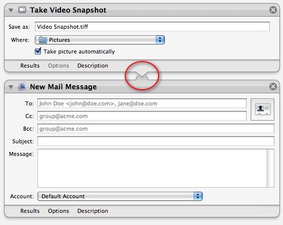 Note that a connection between the two actions is indicated (circled area). This connection means that information or data (in this case an image file) will be passed between the two actions, from the first to the second.